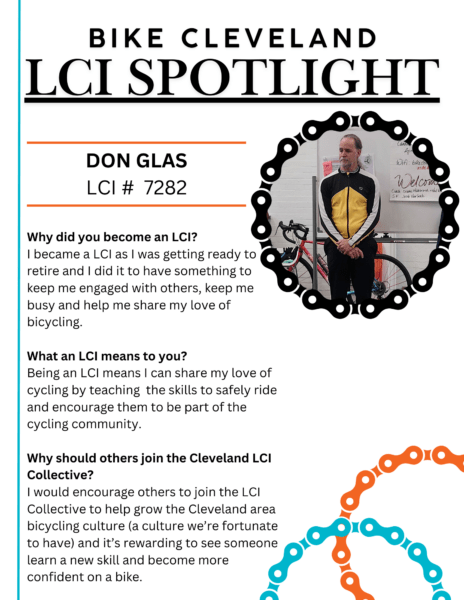 We want to celebrate Don Glas. Don became an LCI in the spring of 2024 and hit the pavement rolling by assisting with Bike Cleveland’s in-school education programs. Don stated, “The best part of being an LCI so far has been when one of the students I was teaching finished a training exercise with his group and asked if he could ride the exercise again with the next group because he “just liked to ride bikes.”