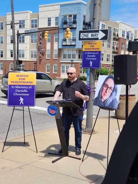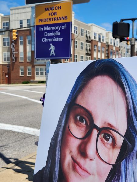 This first sign honors CMSD teacher Danielle Chronister who was struck and killed on November 3rd, 2021. Her life ended at the intersection of E. 21st Street and Chester Avenue by a truck driver who failed to yield to her in the crosswalk as she walked to work just a few blocks from her home.