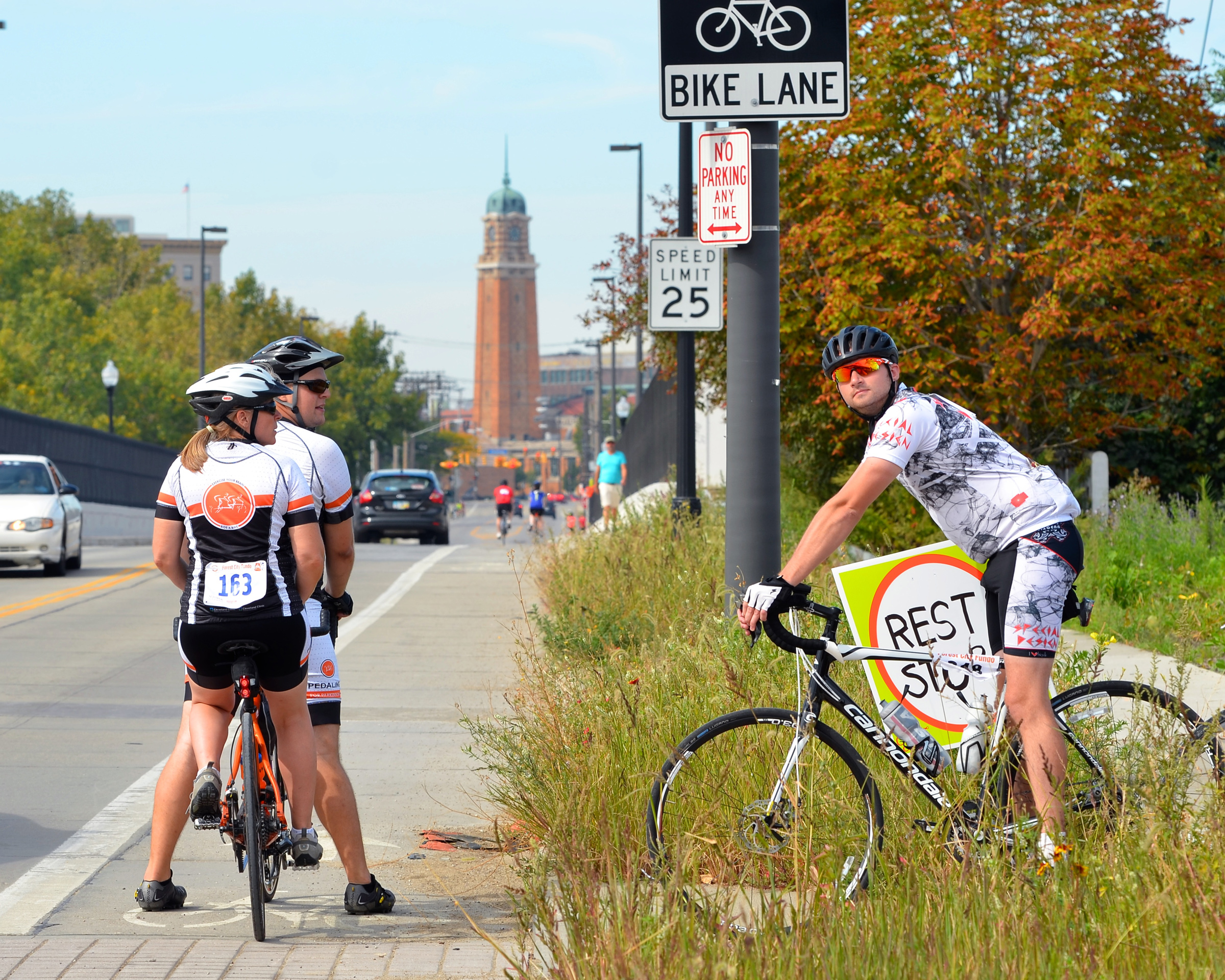 All of that late-night action merely set the table for the big show to come on Sunday, when 650 riders took part in the Forest City Fundo, presented and organized by our own Bike Cleveland. The casual group ride, both an interpretation and a play on words of the Italian Gran Fondo concept (which means “big distance,” loosely translated) was designed to expose riders of all ages and experience levels to many Cleveland neighborhoods they might never have explored before. The Fundo offered three different lengths to choose from, including a 10-mile family ride, an intermediate and approximate metric half-century (about 33 miles) and a full metric century (about 62 miles). All rides were fully supported, signed, and marked out, with rest stops (stocked with snacks and drinks, all included with the price of registration) along the way and bike mechanics stationed strategically along the route to provide repairs on the go.
