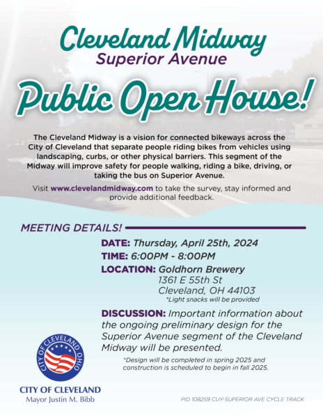 The Cleveland Midway is a vision for connected bikeways across the City of Cleveland that separate people riding bikes from vehicles using landscaping, curbs, or other physical barriers. These Open House opportunities are your chance to see the designs in person, and provide feedback based on your experiences. If you are unable to make this event, you can provide feedback via the survey.