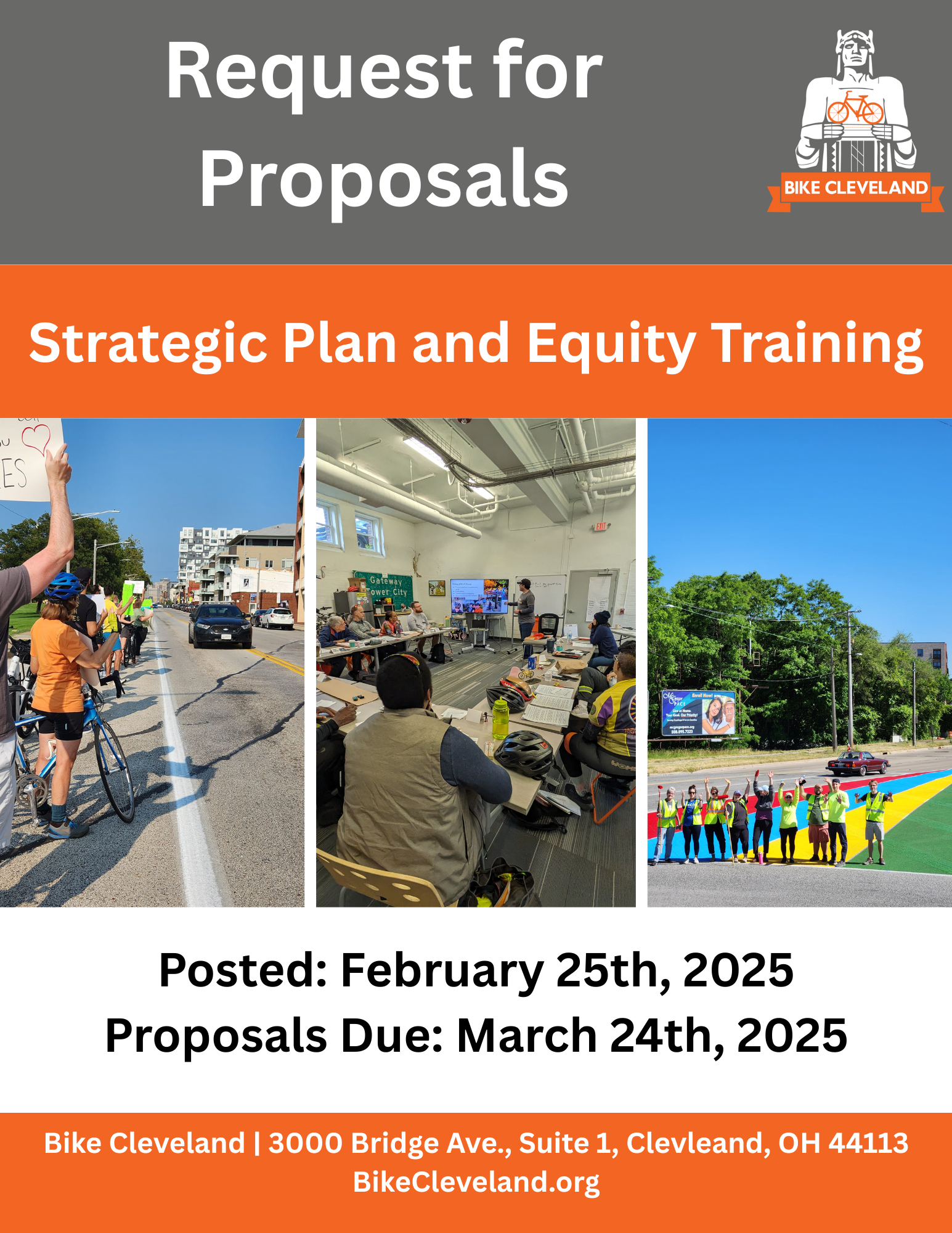Bike Cleveland is seeking proposals from qualified consultants to assist in updating our strategic plan. This update is crucial to align our organizational goals with evolving community needs and to ensure that equity is central to all aspects of our work. Additionally, we seek a consultant team who can incorporate board and staff training on centering equity principles in our work.